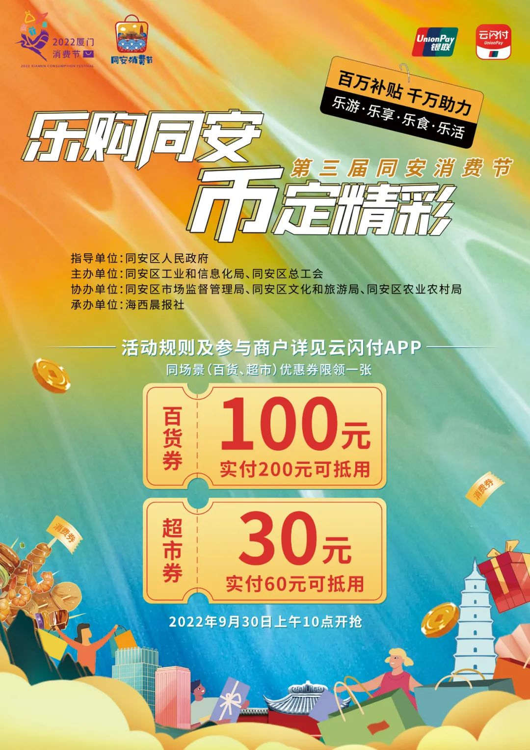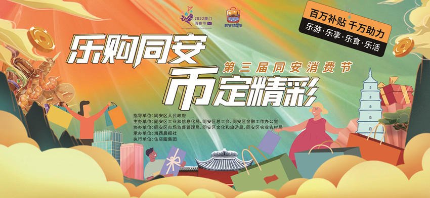 为促进同安区商圈消费,由同安区政府人民政府指导,同安区工业和信息化局、同安区总工会、同安区金融工作办公室主办,同安区市场监督管理局、同安区文化和旅游局、同安区农业农村局协办,海西晨报社承办,住店圈(颜食生活)集团执行的「乐购同安“币”定精彩」第三届同安消费节系列活动。