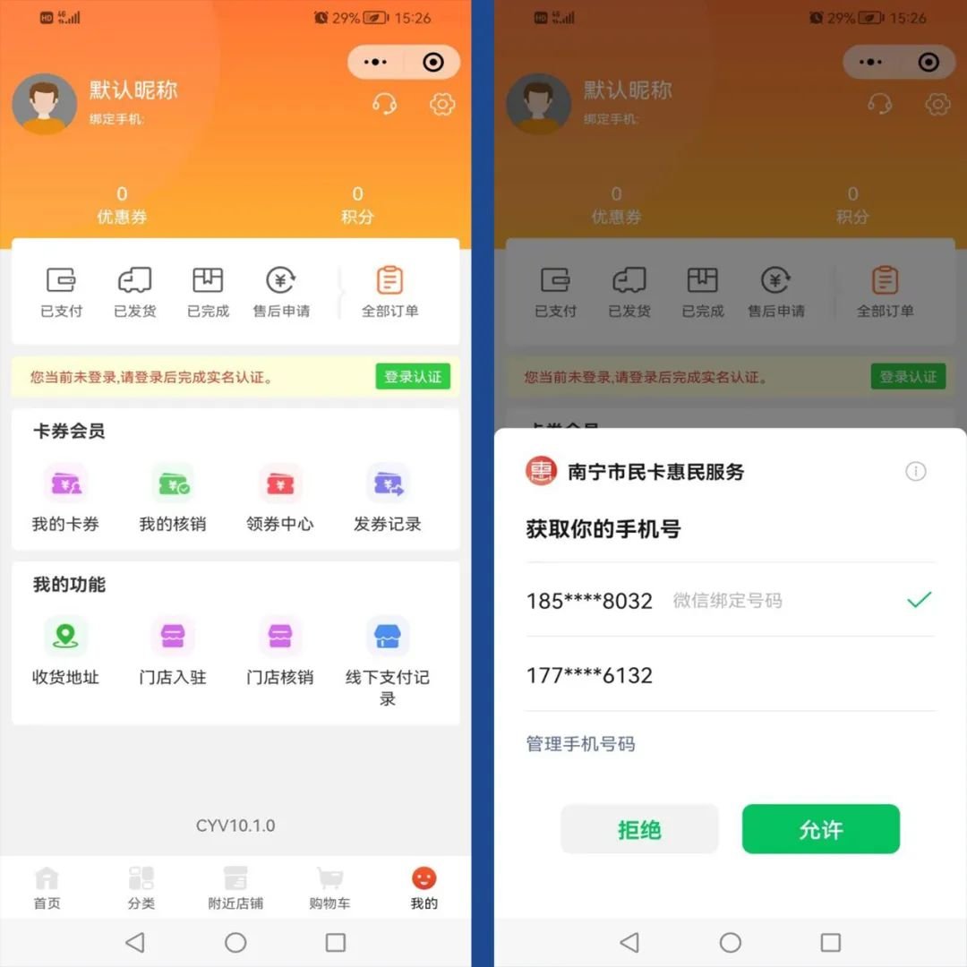 02、点击“我的”-“登录认证”,随后点击“允许”按钮获取手机号。