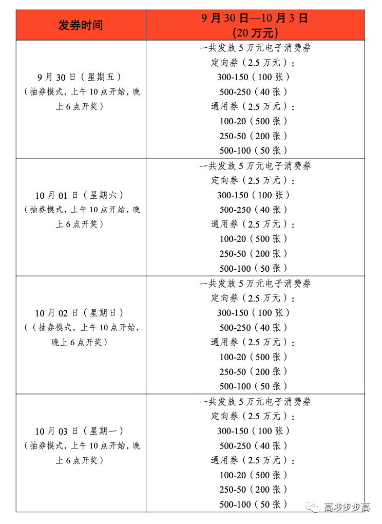 1、定向券:共发放10万元定向券,面值分两种,分别是当次消费即可享“满500元减250元”、“满300元减150元”面值的电子消费优惠券。消费者领取电子消费券并到我镇参与活动的餐饮、住宿纳统企业消费即可享受当次消费立减优惠。