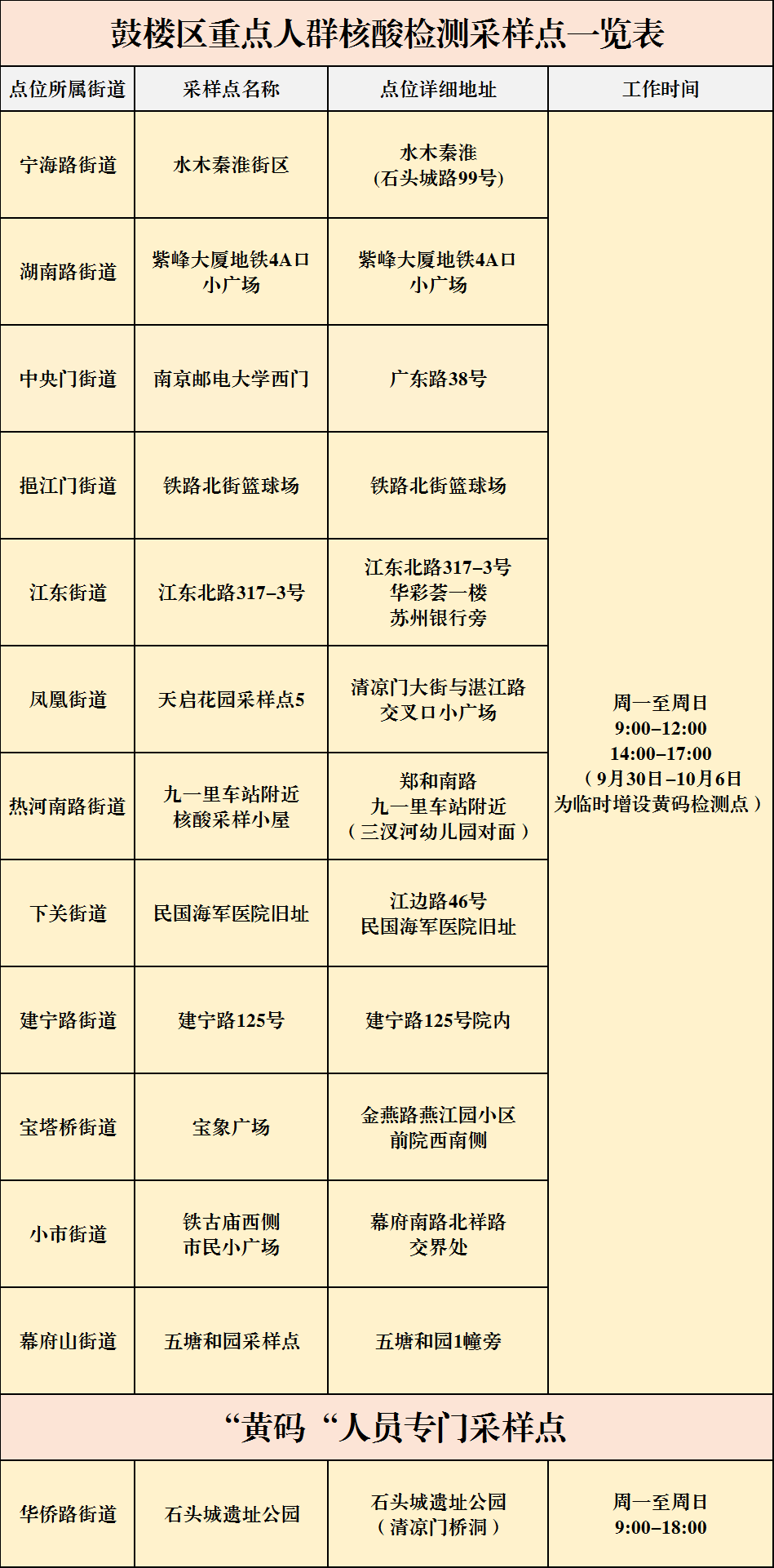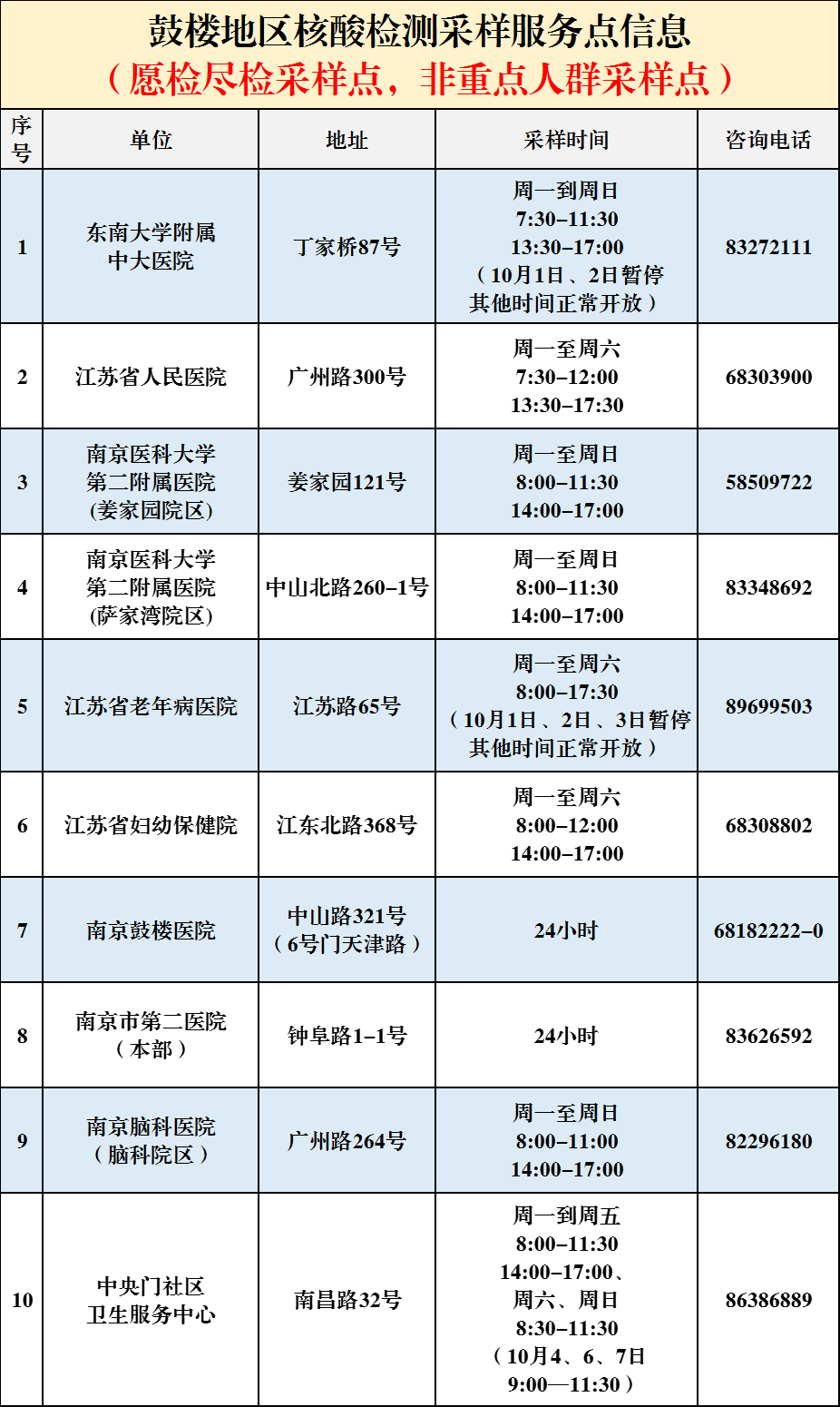 2022国庆期间南京鼓楼区核酸采样点+服务时间安排