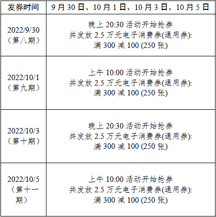 洪梅镇经济发展局拟于2022年9月30日-10月5日投放四期消费券,具体电子消费券投放工作如下: