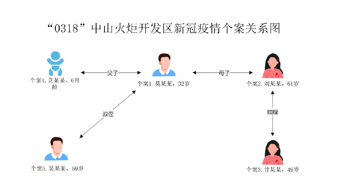 病例5:吴某某,男,59岁,系病例1的叔叔,病例2丈夫的弟弟,家住病例1-4附近,中山市开发区东利北街西14号后面。3月18日纳入隔离管控,当天核酸检测阴性,3月19日核酸检测阳性。