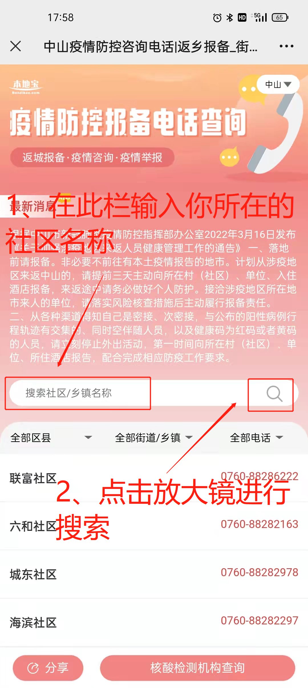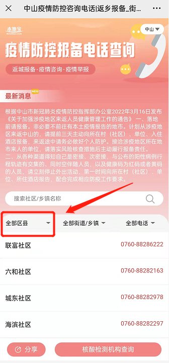 3、点击后就会出现所在区、镇或街道的所有社区报备电话。在电话区域上下滑动可查看更多信息。