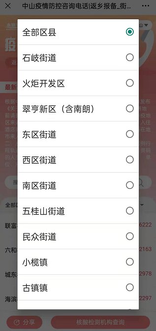 1、点击“全部区县”,查看中山各区镇。
