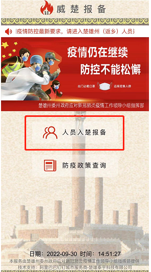 1、所有州外来(返)楚人员在入楚前,须提前24小时通过“威楚报备”小程序或电话方式向目的地县市、乡镇、社区或单位进行报备。