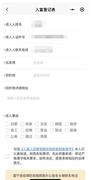 第三步:进入后,填写个人信息,以及出发地、目的地城市,以及进入事由后,点击保存即可;