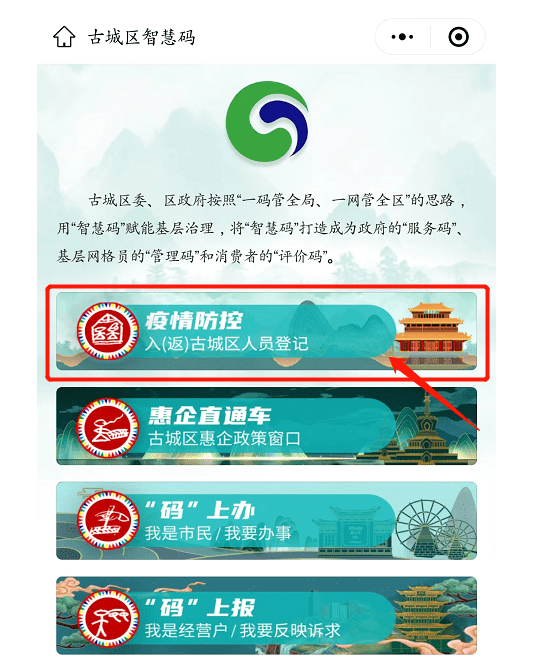 第三步:选择登记类型,本地或暂住人员使用【入(返)古城区人员登记】,来丽游客选择【游客登记】;
