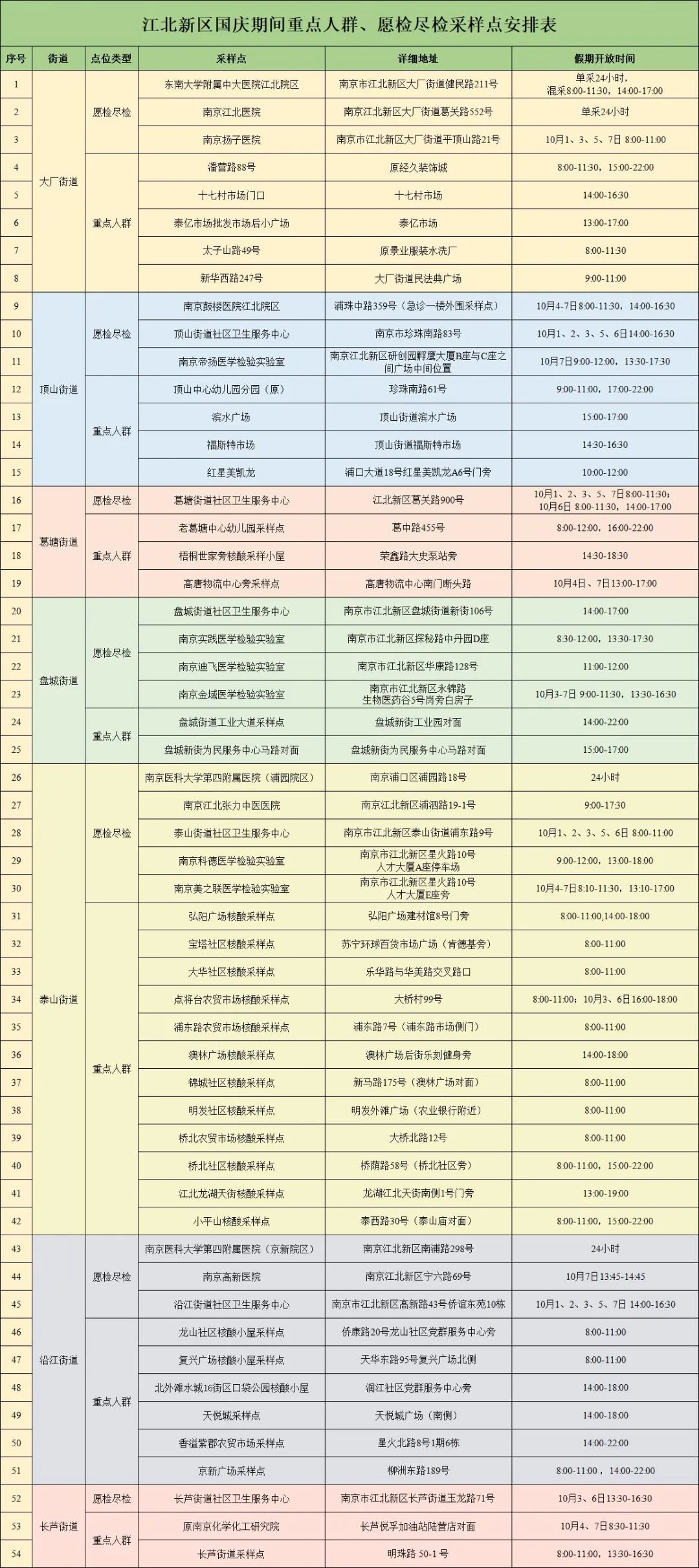 2022国庆假期南京江北新区核酸检测采样点安排一览