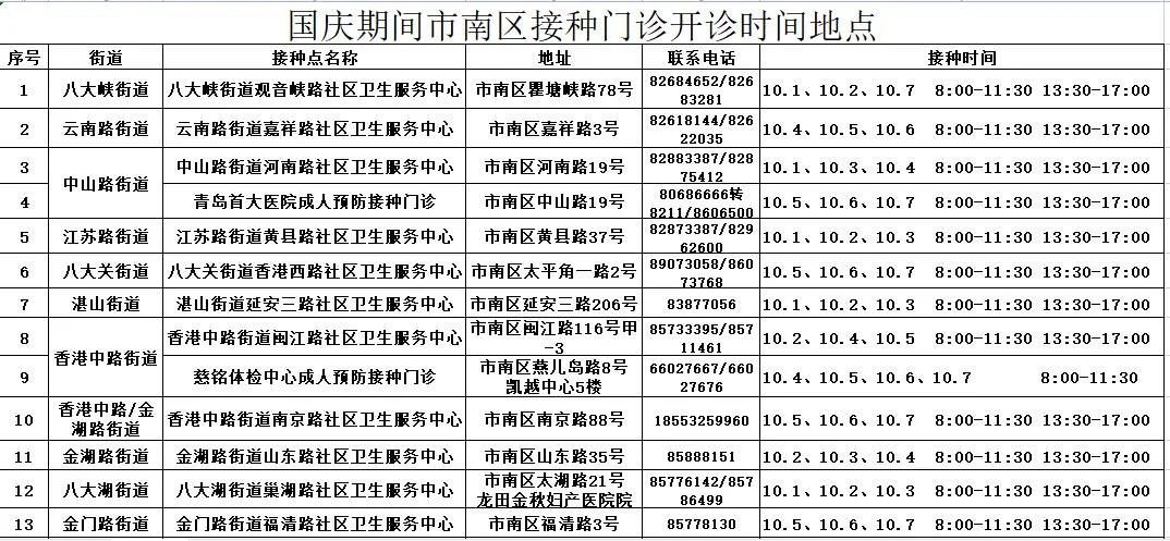 为方便居民朋友们国庆假期期间进行疫苗接种,现将市南区国庆期间疫苗接种安排告知如下:
