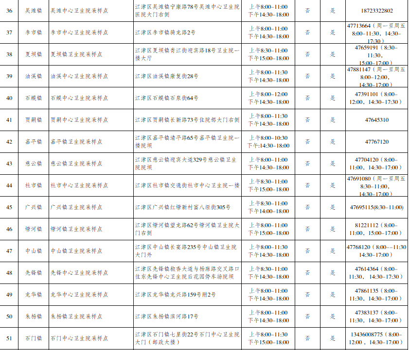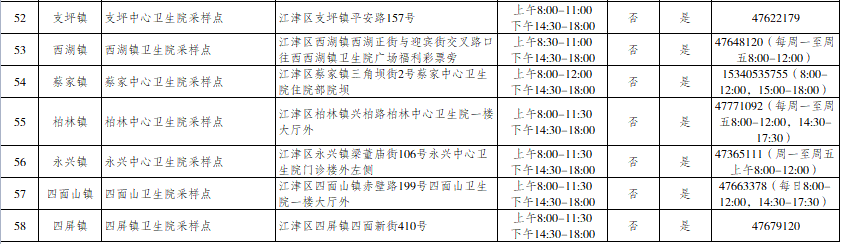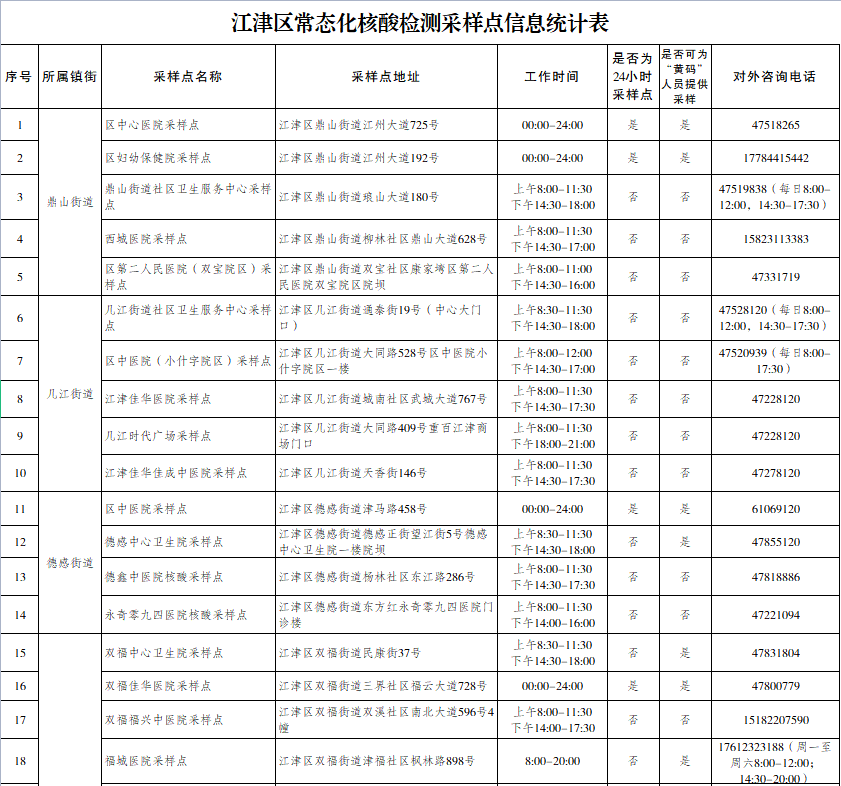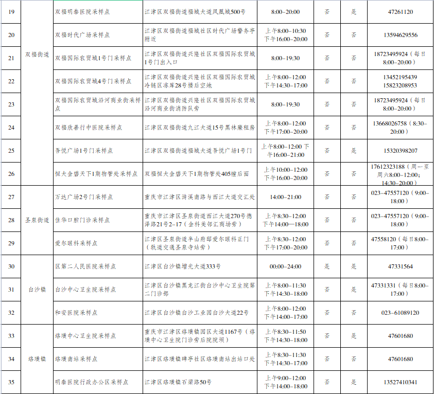 江津区便民核酸采样点信息汇总表