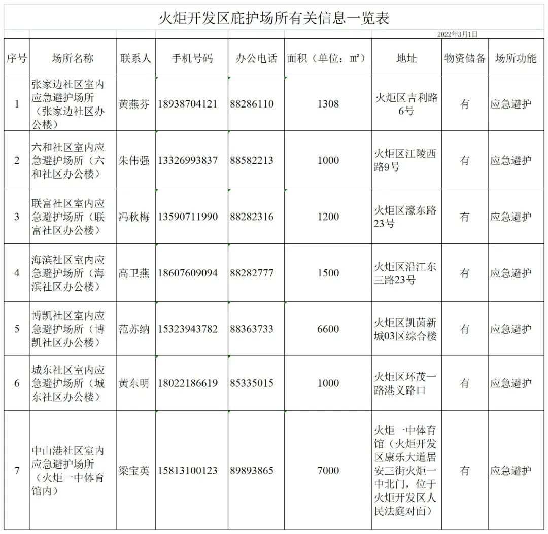 经研究决定:火炬开发区(不含民众街道)从即日21时起将为疫情防控原因暂时不能返家的群众设置24小时全开放临时庇护中心。庇护场所名单如下表,庇护场所备有席子、棉被、矿泉水、方便面等基本物资供群众免费使用。