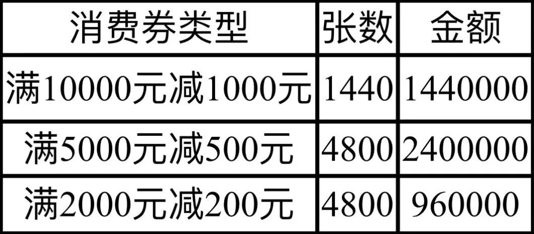 同时,金牛区还将在国庆(10.1—10.3)、双11、双12每天10:00—24:00发放满10000减1000、满5000减500、满2000减200元的家电消费券,累计发放13800张,总优惠金额达600万元。
