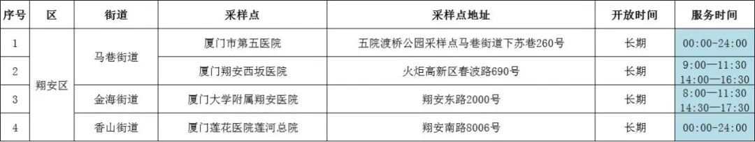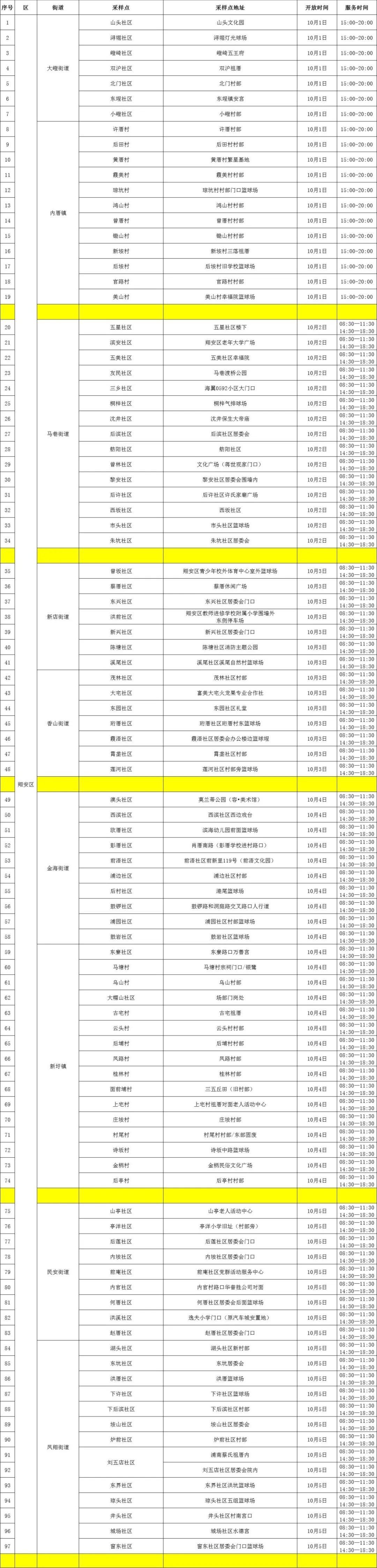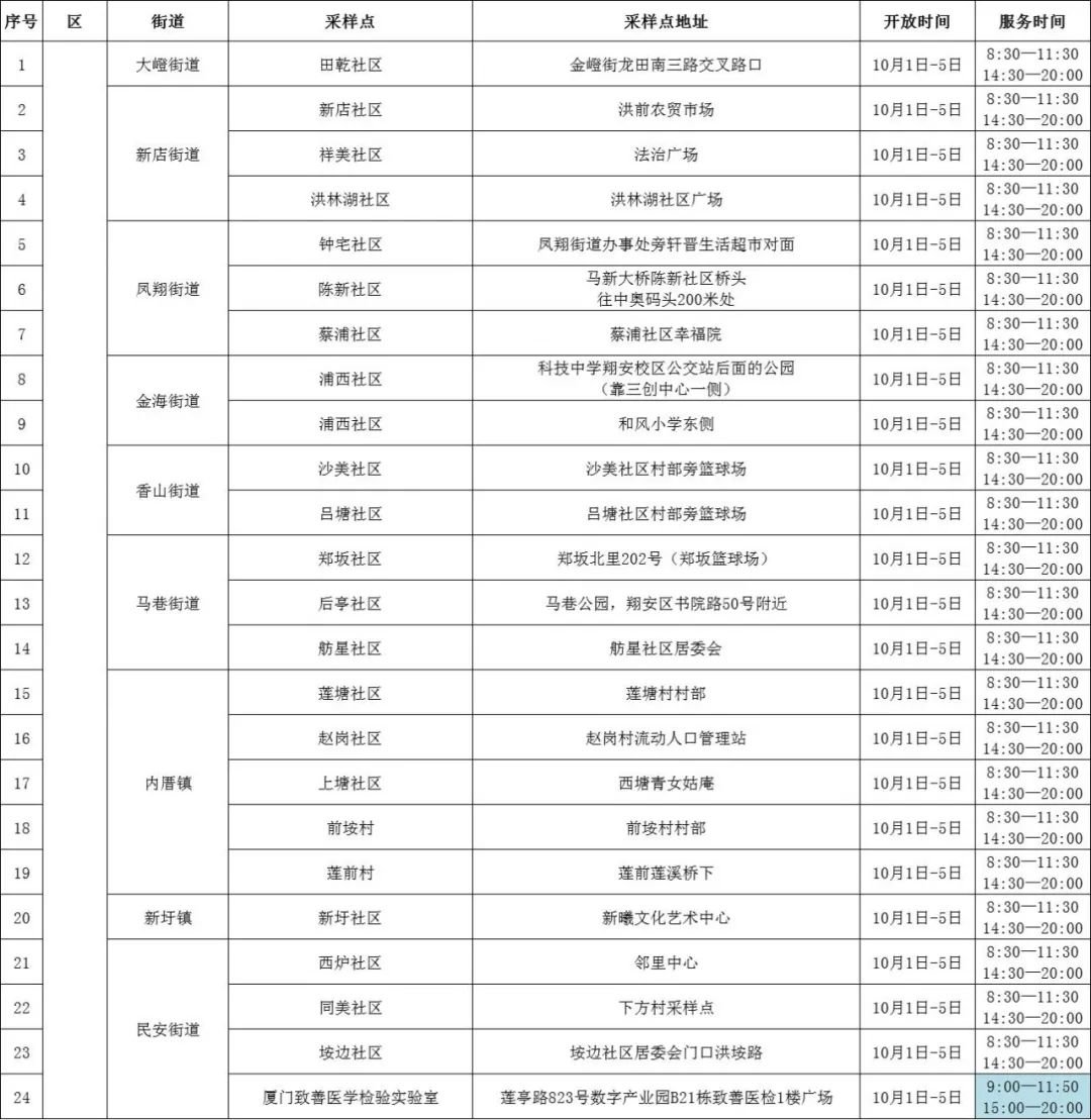 翔安区便民核酸采样点(10月1日—10月5日)