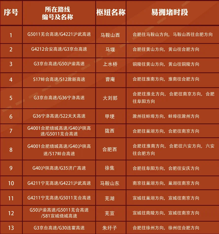 G3京台高速滨湖新区、黄山南门、九华山,G35济广高速天柱山,G36宁洛高速曹庄,G40沪陕高速吴庄,G4001合肥绕城高速包河大道、蜀山、金寨路、集贤路、龙塘、双墩,G42沪蓉高速天堂寨,G4211宁芜高速宁马等高速公路收费站,