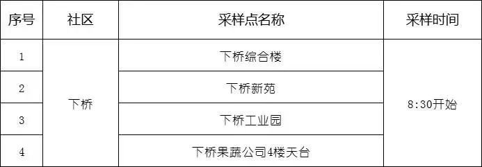 根据疫情防控需要,东城街道定于10月2日在下桥社区开展区域核酸检测,请社区辖区内常住人口、户籍人口、流动来(返)人员主动配合参检,具体采样点信息如下: