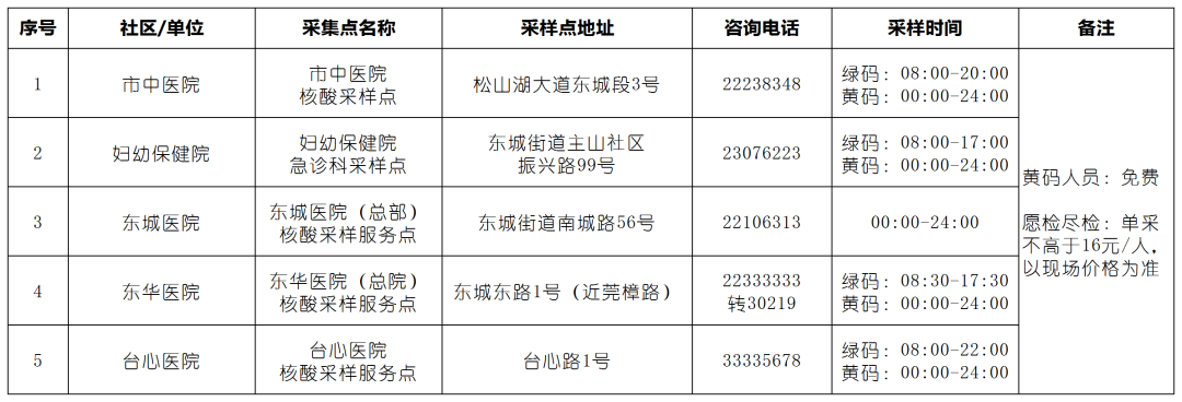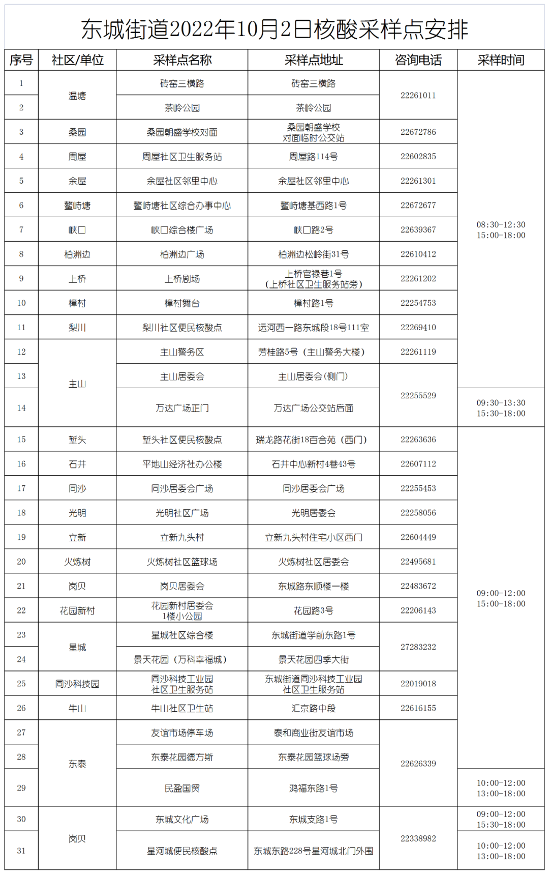 下桥社区开展核酸检测期间,东城街道其他社区便民核酸采样点免费开放,具体采样时间及检测对象如下: