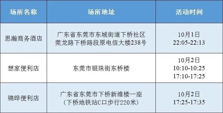 10月2日晚上,东城发现一例外省来莞人员新冠肺炎初筛异常个案,请到过以下场所的市民立即向所在社区报备并前往就近的核酸检测采样点进行核酸检测。