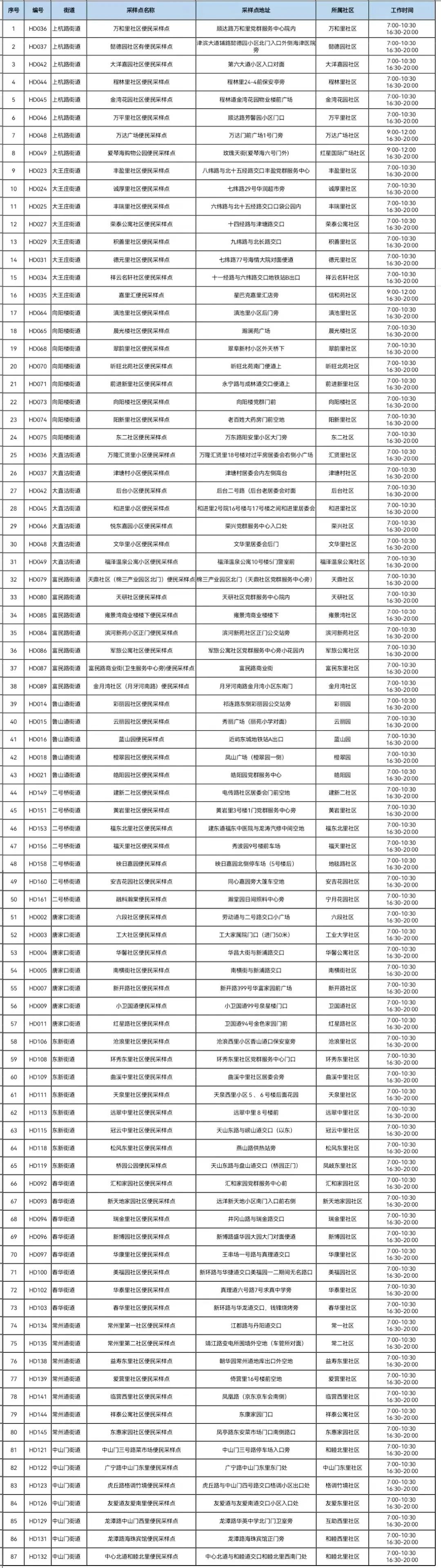 常态化核酸检测便民采样点明细表(10月5日)
