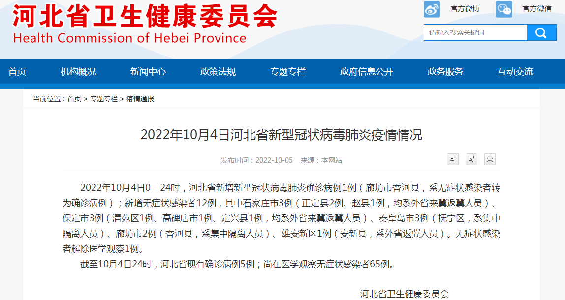 截至10月4日24时,河北省现有确诊病例5例;尚在医学观察无症状感染者65例。