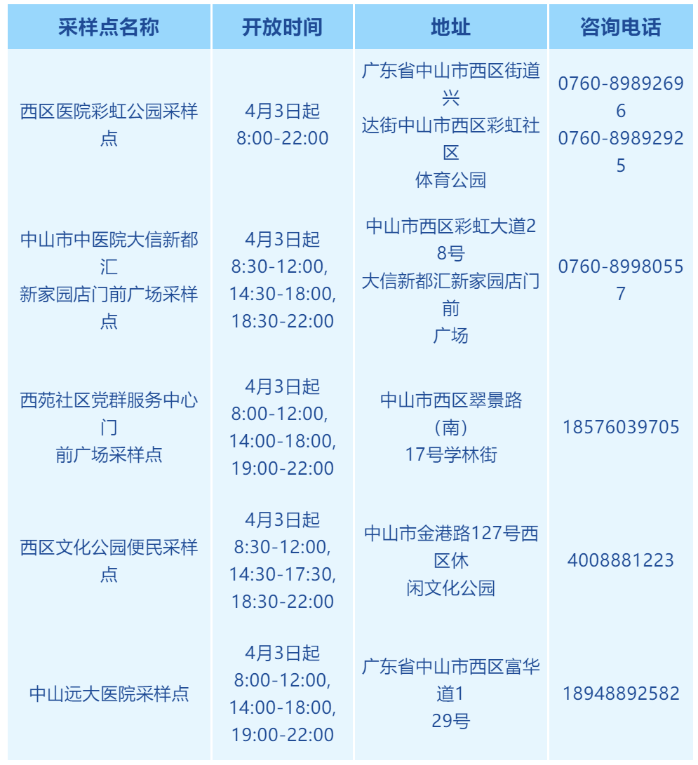 因4月2日我街道将开展区域核酸检测工作,为确保核酸检测工作有序进行,4月1日,西苑社区党群服务中心门前广场便民核酸检测点暂停开放;4月2日,西区医院彩虹公园、西苑社区党群服务中心门前广场、中山市中医院大信新都汇新家园店门前广场、西区休闲文化公园、中山远大医院便民核酸检测点全部暂停服务。
