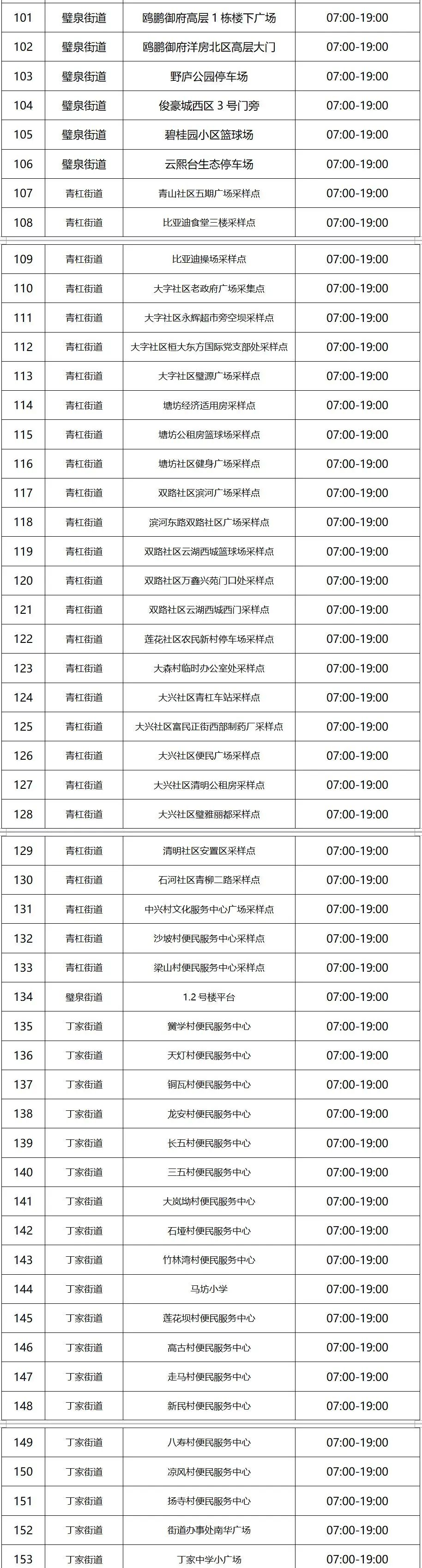 2022年10月9日、10日、11日07:00-19:00对我区市民群众(包括本地常住人口、暂住人口、临时流动人口、外籍人口等)分批次开展核酸检测。其中,大中小学及幼儿园学校教职员工于10月9日进行;璧城街道、璧泉街道、青杠街道的市民群众于10月10日进行;除璧城街道、璧泉街道、青杠街道的市民群众外12个镇街的市民群众于10月11日进行。