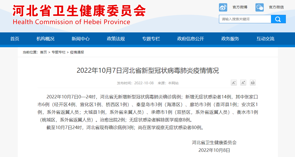 2022年10月7日0—24时,河北省无新增新型冠状病毒肺炎确诊病例;新增无症状感染者14例,其中张家口市6例(经开区4例、宣化区1例、桥西区1例)、秦皇岛市3例(海港区)、廊坊市3例(香河县1例;安次区1例,系外省返冀人员;大城县1例,系外省来冀人员)、承德市1例(双桥区,系外省返冀人员)、衡水市1例(桃城区,系外省返冀人员)。治愈出院2例;无症状感染者解除医学观察8例。