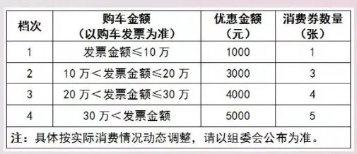 消费者于3月11日至3月31日期间到参与活动的限上车企(名单另行公布,敬请关注,或现场到店咨询)成功购车,均可按以下档次享受相应补贴优惠,由车企协助消费者领券兑付。购车消费券数量有限,先购先得,用完即止。