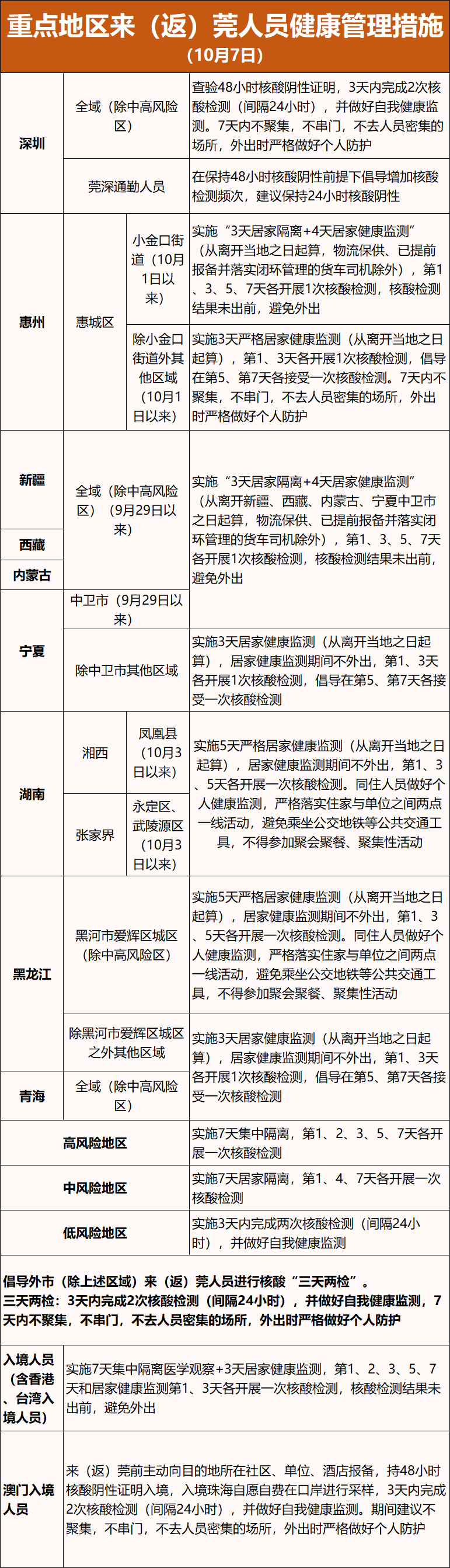为有力落实“外防输入、内防反弹”总策略,切实维护人民群众生命安全和身体健康,对来(返)莞人员采取以下健康管理措施:
