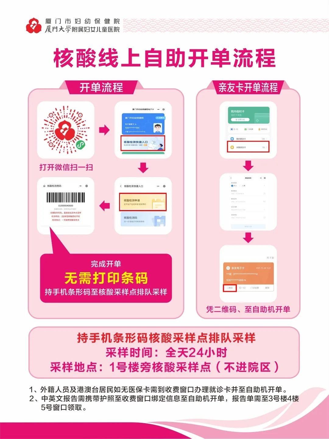 3、境外人员开单流程:收费处办理就诊卡→自助机开单→持条码至核酸采样室采样→核酸结果6小时后出具,可到现场自助机打印或亲友协助在我院公众号或小程序核酸报告端口凭条码号查询。