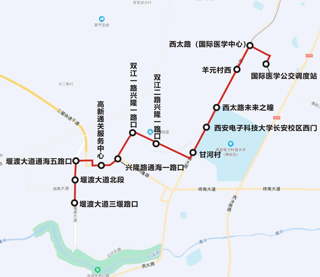 线路设置站点13个: 堰渡大道三堰路口、堰渡大道北段、堰渡大道通海五路口、高新通关服务中心、兴隆路通海一路口、双江一路兴隆一路口、双江二路兴隆一路口、甘河村、西安电子科技大学长安校区西门、西太路未来之瞳、羊元村西、西太路(国际医学中心)、国际医学公交调度站。