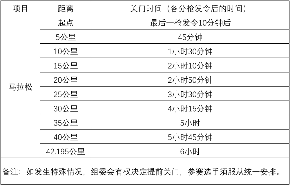 为保证选手比赛安全和城市道路交通秩序,各公里点关门后,比赛计时感应地毯即停止工作,赛道解除交通管制并恢复正常交通,选手应及时停止比赛退出赛道,等候组委会援助车或乘坐公共交通车辆抵达终点。否则由此引发的事故将由该名选手自行承担相应法律责任和赔偿责任。