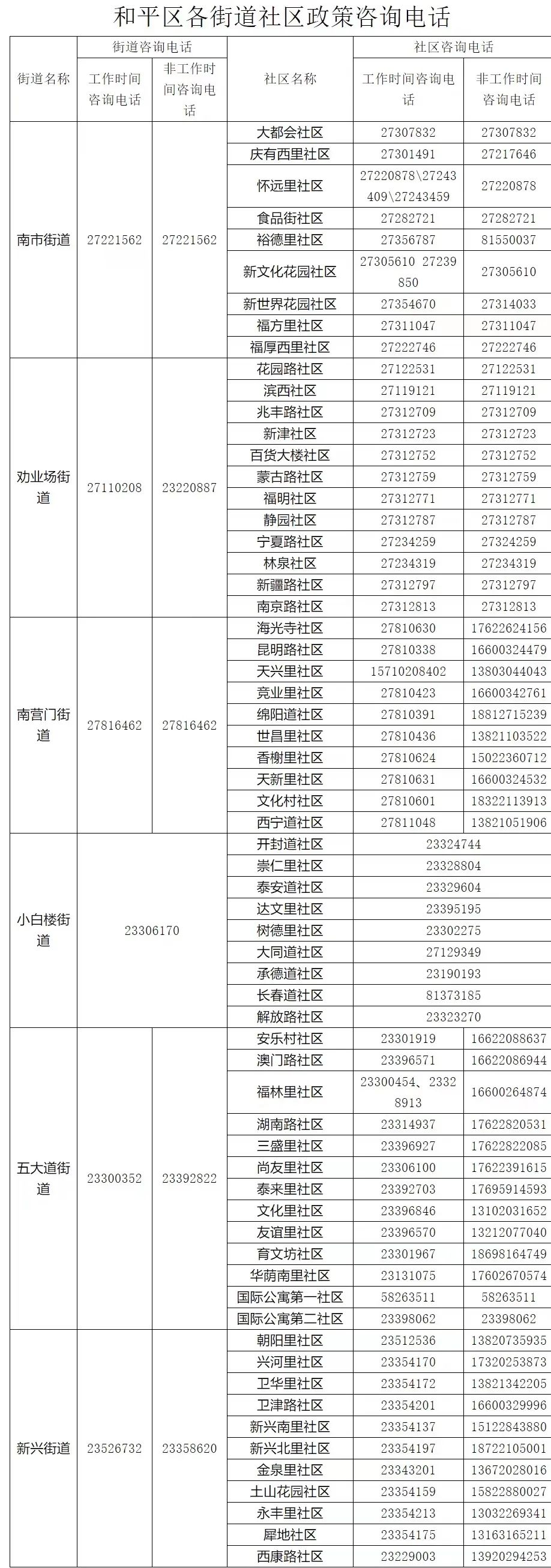 ☎和平区各街道社区政策咨询电话: