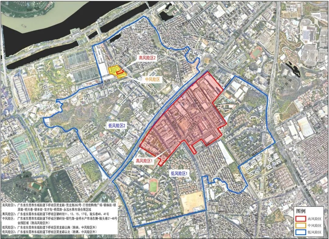 低风险区即东城街道下桥社区莞龙路以南(除高、中风险区外)、以及东城街道下桥社区莞龙路以北(除高、中风险区外),实行“个人防护,避免聚集”管理,区域内人员做好个人防护,非必要不外出。