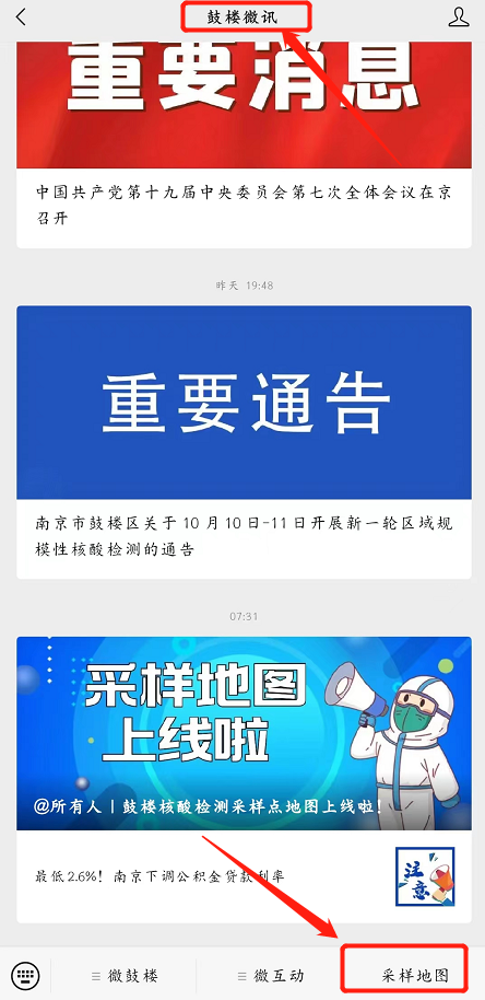 2、点击公众号右下方菜单栏的“采样地图”,进入“鼓楼区核酸检测采样点”应用场景,接下来的操作就参照方式一。