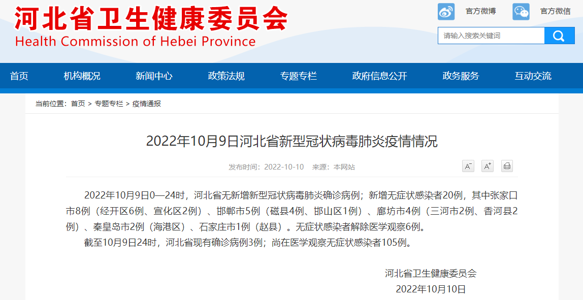 2022年10月9日0—24时,河北省无新增新型冠状病毒肺炎确诊病例;新增无症状感染者20例,其中张家口市8例(经开区6例、宣化区2例)、邯郸市5例(磁县4例、邯山区1例)、廊坊市4例(三河市2例、香河县2例)、秦皇岛市2例(海港区)、石家庄市1例(赵县)。无症状感染者解除医学观察6例。