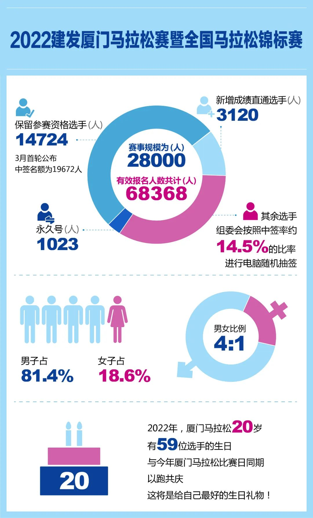 2022厦门马拉松赛事规模为28000人,有效报名人数共计68368人,其中