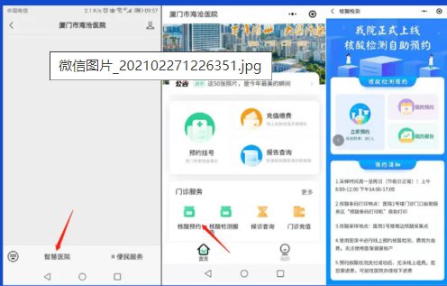 搜索厦门市海沧医院公众号,点击菜单栏左下角智慧医院,进入小程序后选择核酸预约(不要选择预约挂号),根据健康码情况选择就诊卡(未添加者可选择无卡建档),选出就诊日期与时段后提交预约(稍侯片刻会自动跳出),确定后形成一维码,打开一维码排队采样。