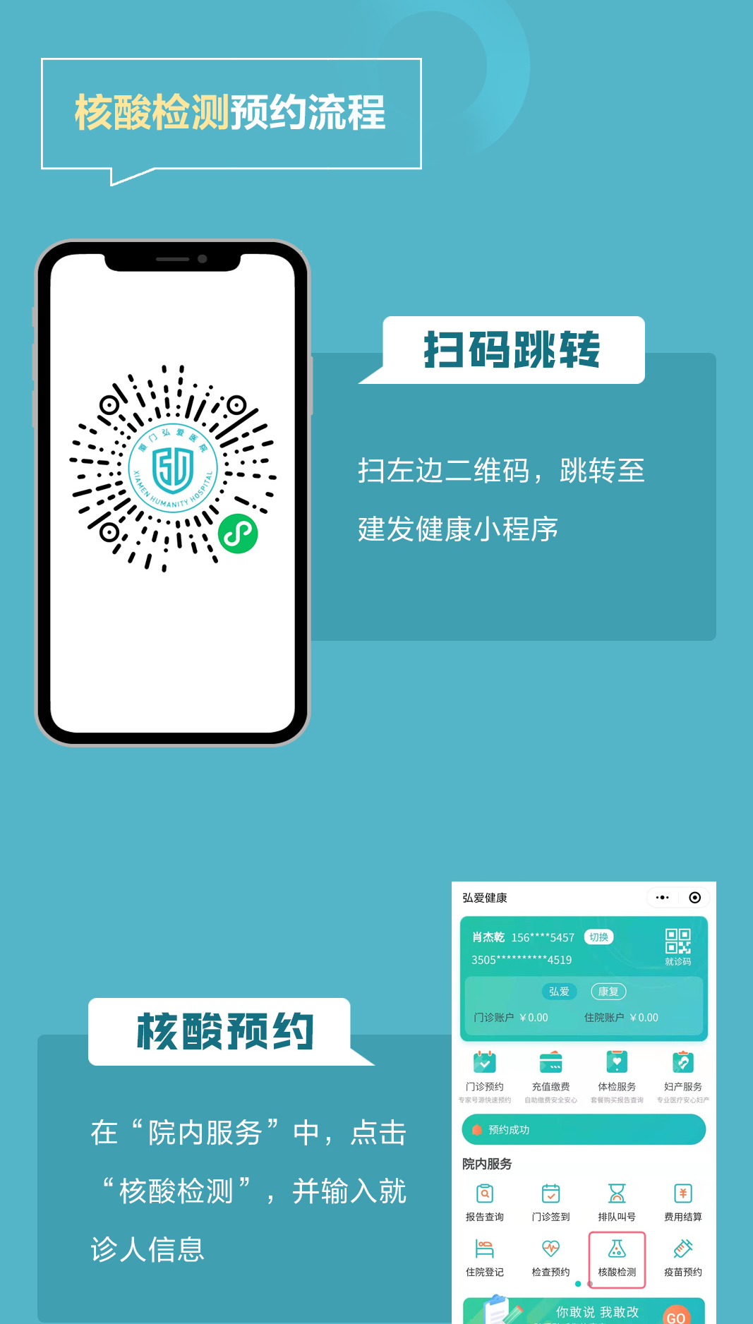 2、关注建发健康:可通过【建发健康】微信公众号进行免费预约,并将预约码截图保存。(仅口咽拭子免费预约,鼻咽拭子需收费)