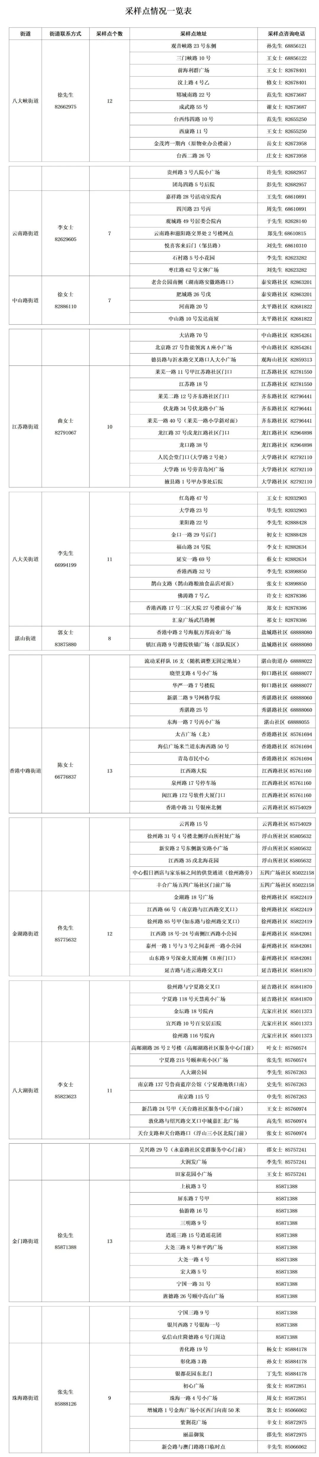 由各街道办事处统一安排采样点,具体信息详见采样点情况一览表(附后),或扫描“市南区核酸检测采样点地图小程序”(附后),对核酸检测采样点进行查询。