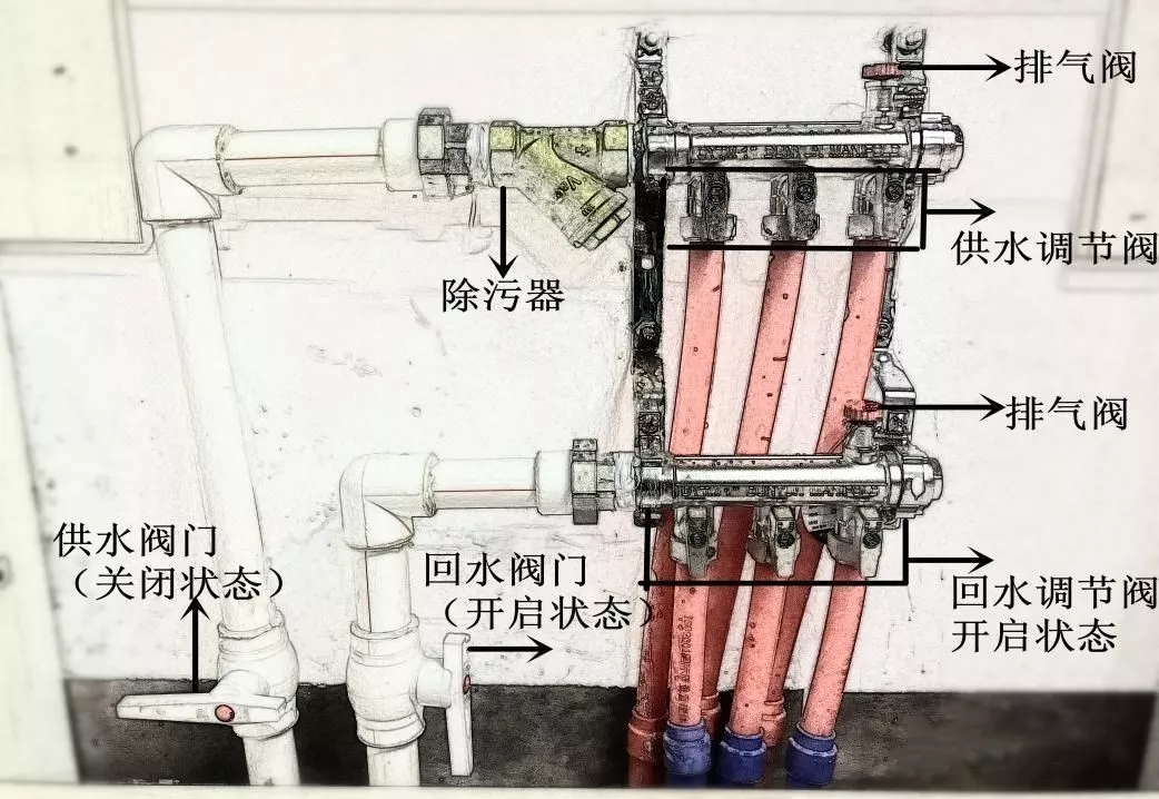 1、关闭采暖总供水和回水阀门(分水器一般在厨房柜里);
