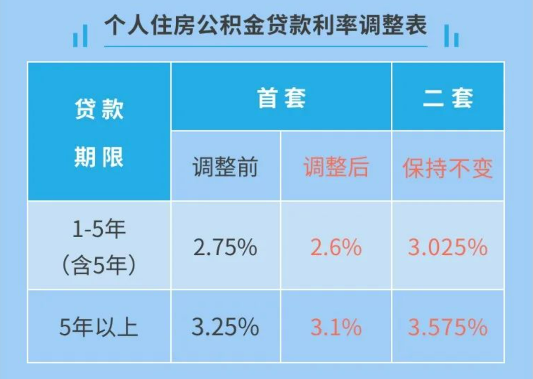 1.下调首套个人住房公积金贷款利率0.15个百分点,5年以下(含5年)和5年以上利率分别调整为2.6%和3.1%。第二套个人住房公积金贷款利率保持不变,即5年以下(含5年)和5年以上利率分别为3.025%和3.575%。