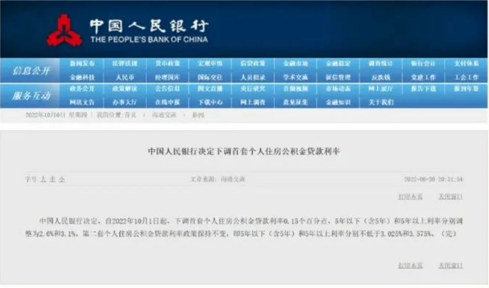 根据2022年9月30日中国人民银行有关决定,自2022年10月1日起,下调首套个人住房公积金贷款利率,现将有关事宜通知如下: