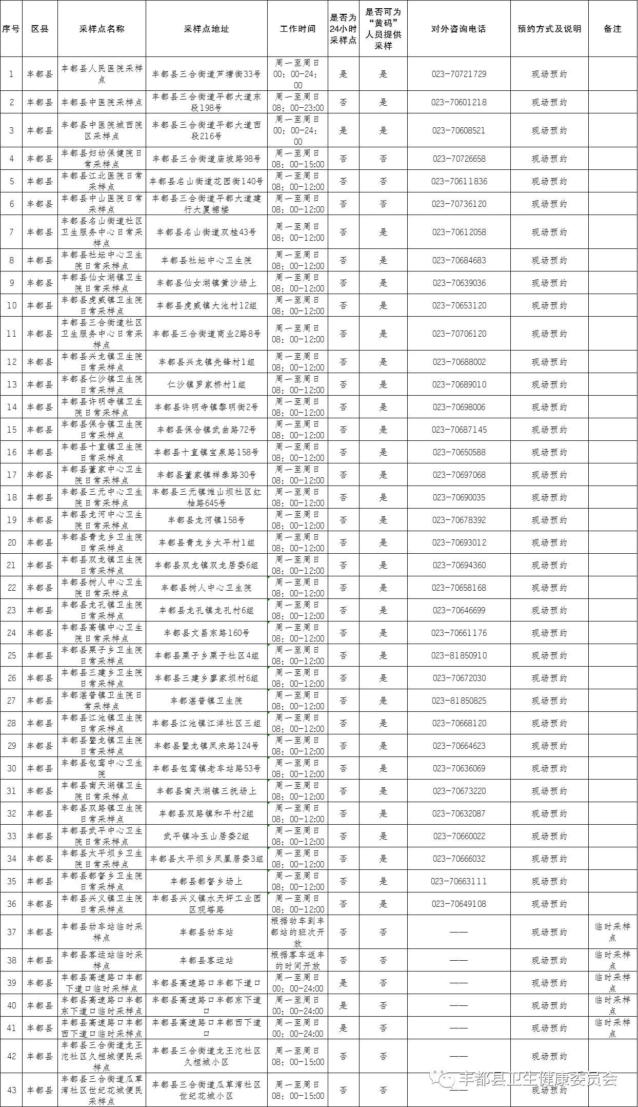 为持续做好丰都县新冠肺炎疫情防控工作,进一步方便市民就地、就近进行核酸检测,现公布全县各镇街便民(常态化固定)核酸采样点及采样时间,具体为: