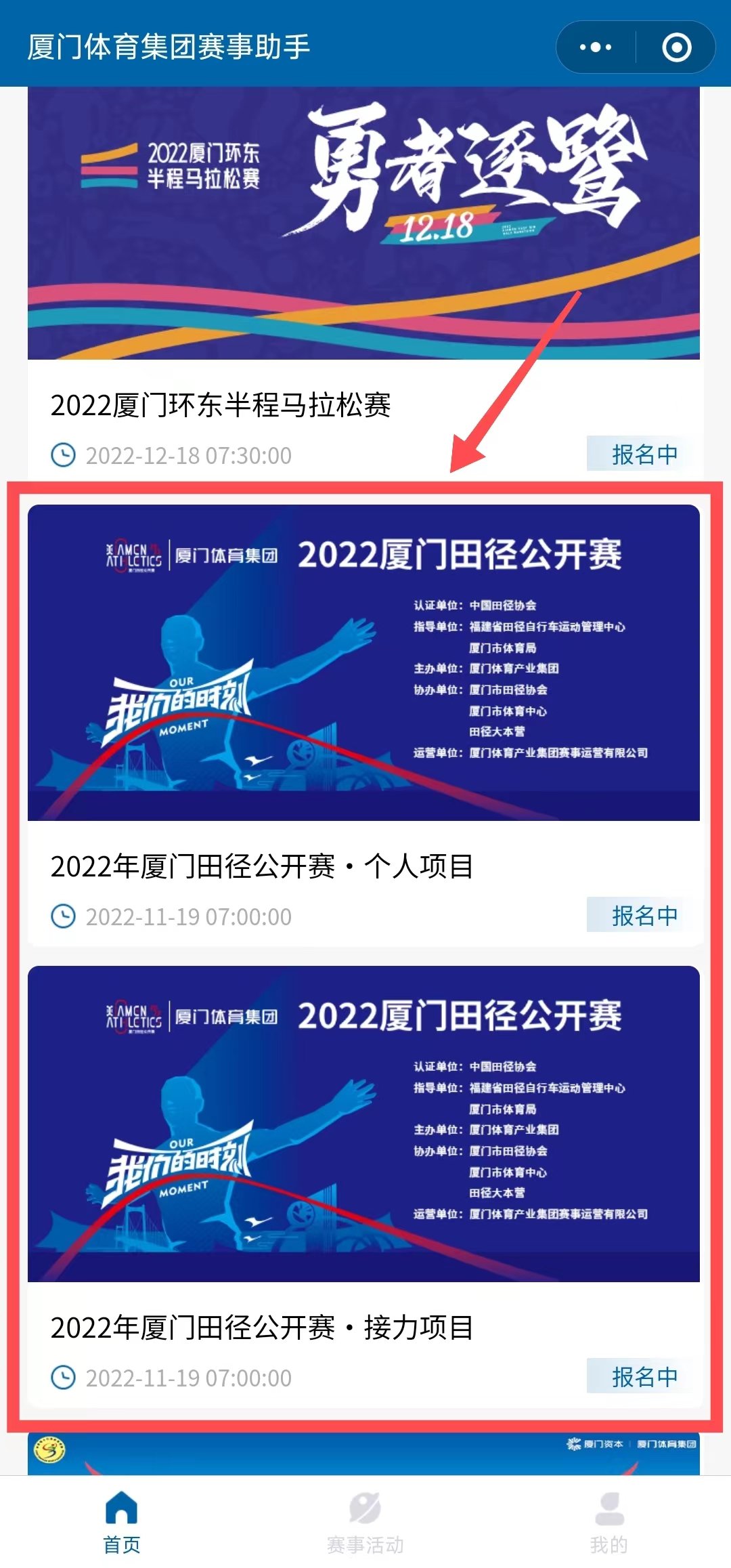 2. 报名流程:通过微信搜索“厦门体育集团赛事”公众号报名,或通过微信小程序搜索“厦门体育集团赛事助手”,点击“厦门田径公开赛”报名即可。【点击查看→】