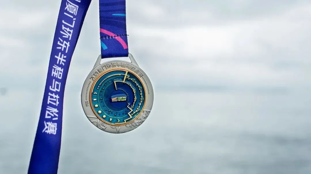 2022厦门环东半程马拉松赛的完赛奖牌选取环东海域浪漫线地标之一「潮汐公园」为主体元素。