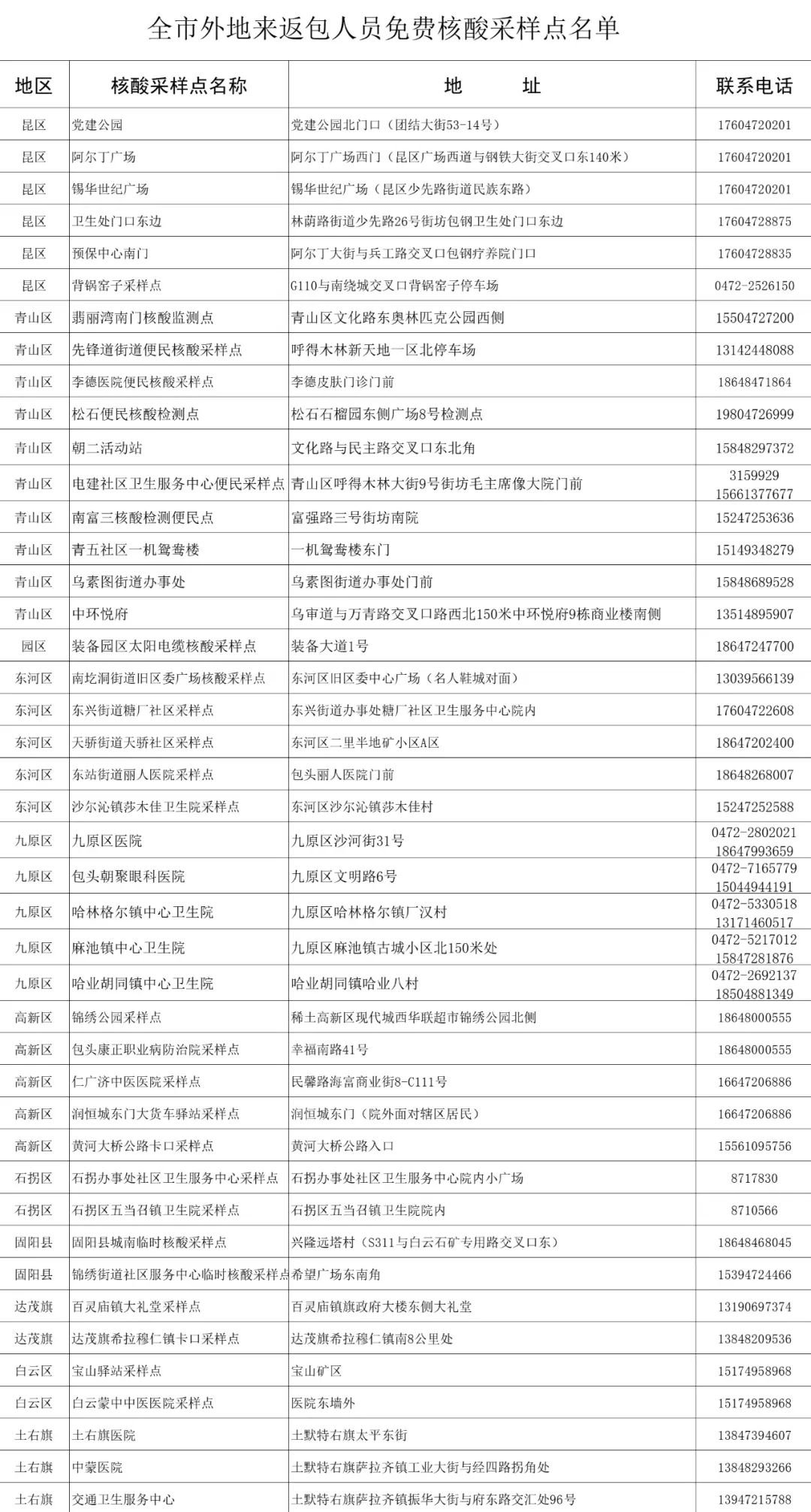 各旗县区来返包人员指定核酸采样点名单