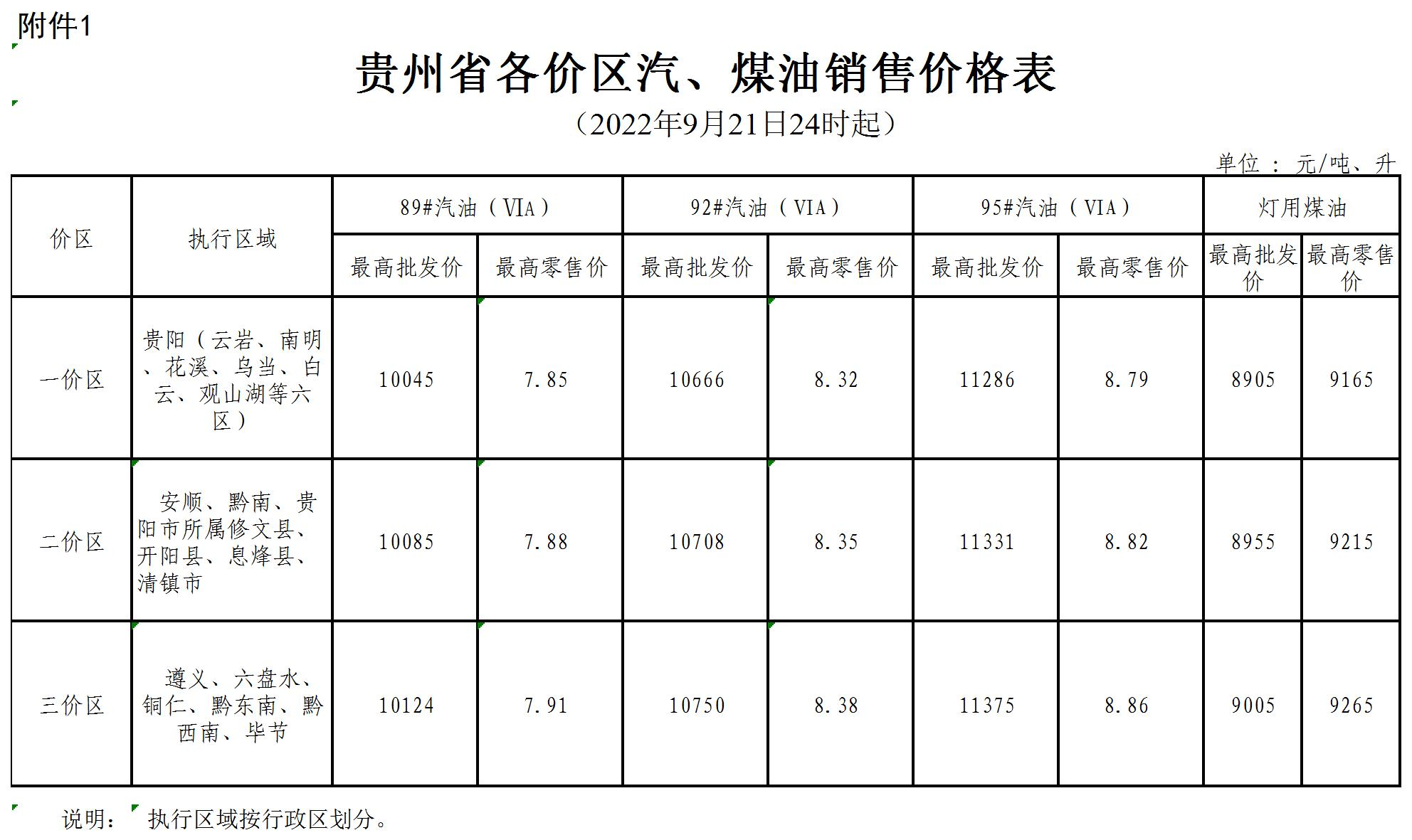 二、贵州省各价区汽、煤油销售价格表(2022年9月21日24时起)