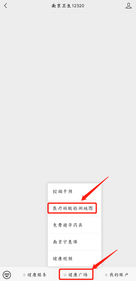 3、“南京卫生12320”公众号,点击“健康广场”--“医疗核酸检测地图”