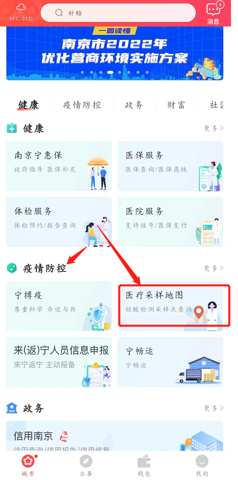 1、我的南京APP首页点击“疫情防控”--“医疗采样地图(核酸检测采样点查询)”