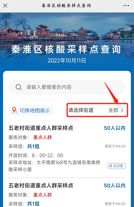 一、扫码查看核酸采样点位地图,点击右上角“选择街道”,就能查看相应街道当前采样点分布情况。